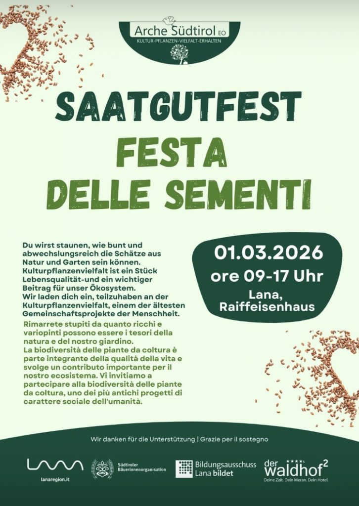 Scambio semi (Saatgutfest) a Lana, vicino a Merano, DOMENICA 1 MARZO 2026 DALLE ORE 9.00 ALLE 17.00, presso la Casa delle Cultura (Raiffeisenhaus)
